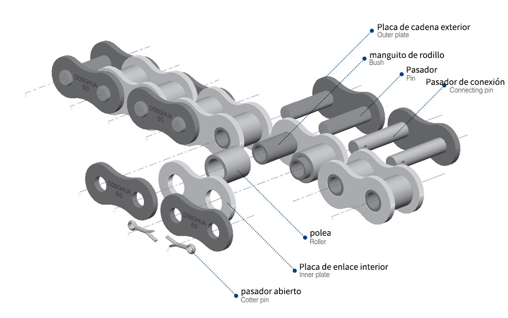 ● La cadena de rodillos de precisión de paso corto cumple con las normas ISO, ASME/ANSI, DIN, JIS y otras normas, principalmente tiene una serie de cadenas de rodillos de precisión de paso corto, series B de cadenas de rodillos de precisión de paso corto, cadenas de rodillos de serie para trabajos pesados y otras series;