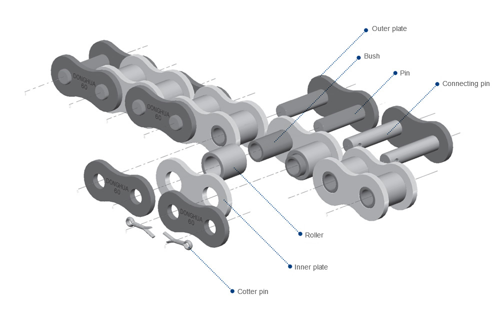 ● Short pitch precision roller chain conforms to ISO, ASME/ANSI, DIN, JIS and other standards, mainly including A series short pitch precision roller chain, B series short pitch precision roller chain, heavy load series roller chain and other series;
