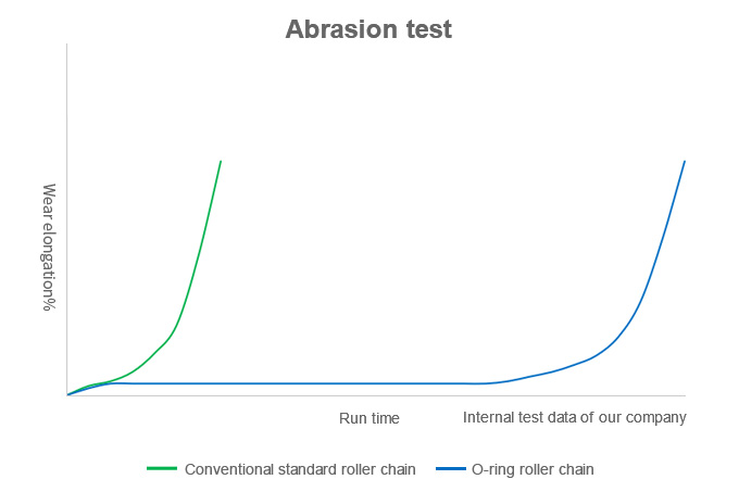 ● Under the test condition, the wear resistance of O-ring roller chain is more than 10 times that of the standard roller chain only after initial lubrication. The products are widely used in agricultural machinery, motorcycles and other open drives.