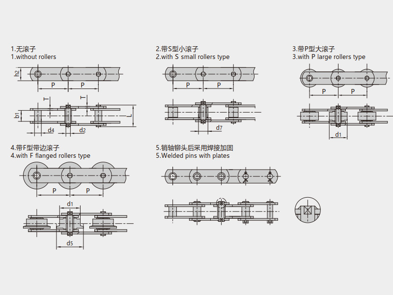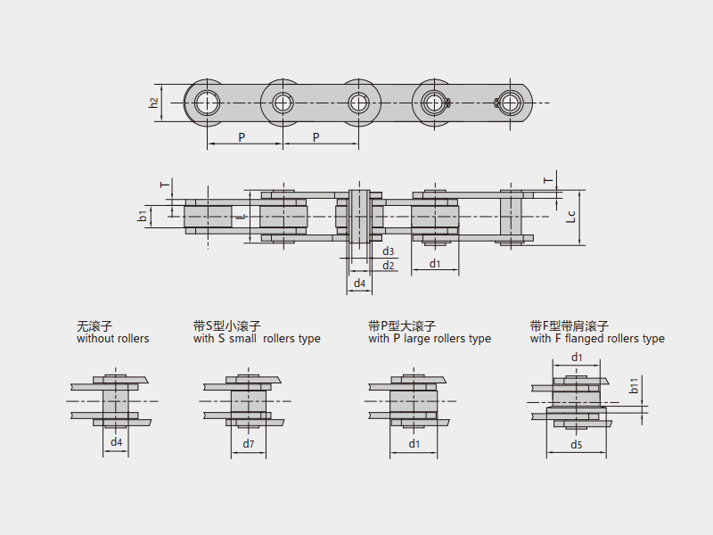 | 带S型小滚子 | 带P型大滚子 | 带F型带肩滚子 |