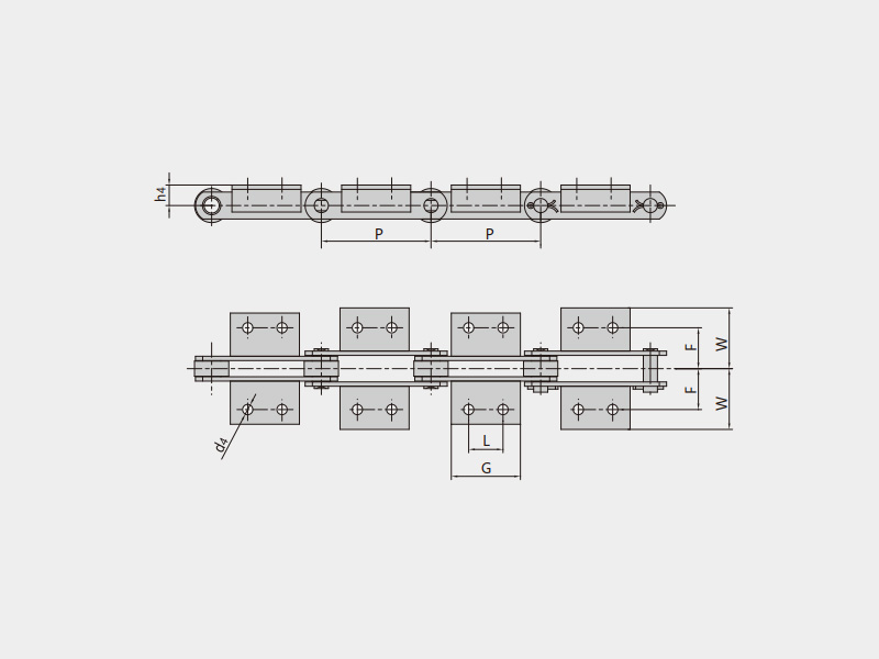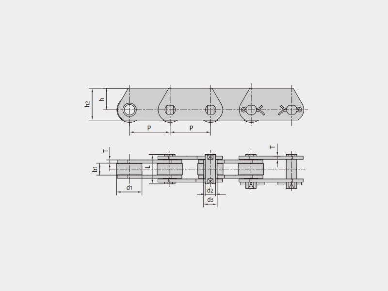● 米制输送链是指链条节距为公制整数(节距范围40mm~1000mm的多种节距)的滚子链或套筒链,滚子有多种结构形式,根据使用工况配置各种附件。